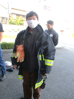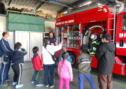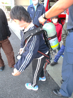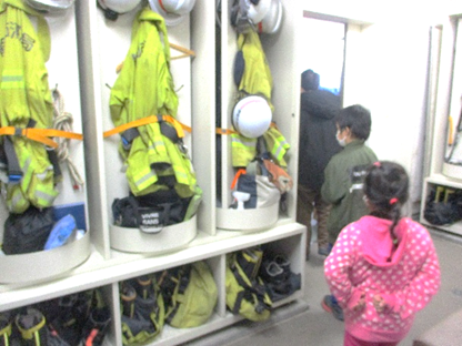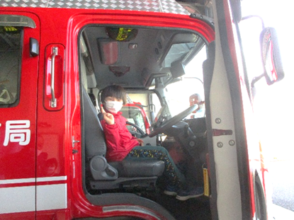 消防士さんのお話を聞いたり、防火服を着る体験やボンベを背負う体験をしたりして、みんな興味津々な様子でした。