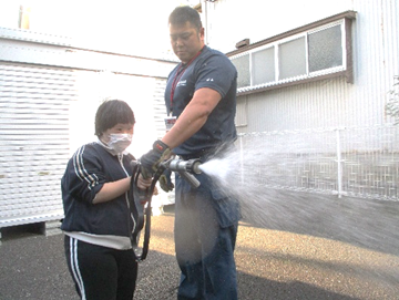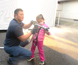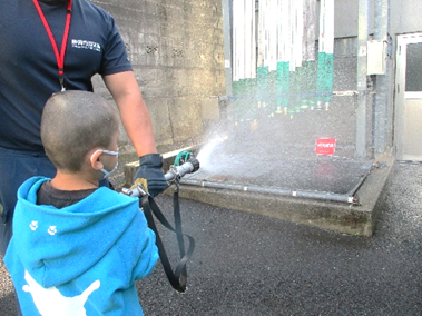 放水体験では、ホースの重さや水の勢いに驚きながらも、真剣な表情で取り組む姿が見られました。