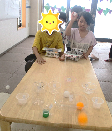 投稿日: 2025年9月24日2025年9月30日 投稿者: oakleaves室内ゲーム 卓球たっきゅうの球たまをバウンドさせて、点数てんすうがついているカップに入いれるゲームを行おこないました。 1人5球投きゅうなげて何点入なんてんはいるか勝負しょうぶ! 狙ねらいを定さだめています 最高記録さいこうきろくは15点てん