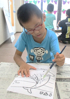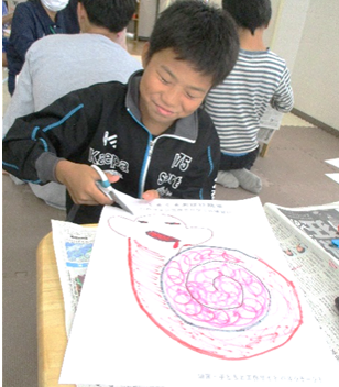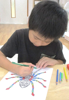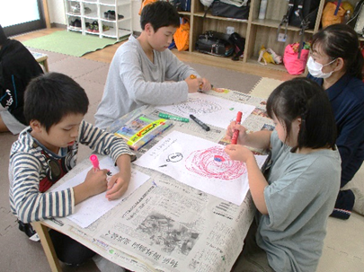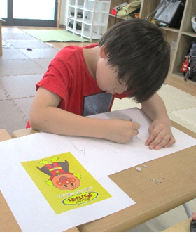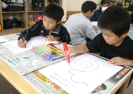 好きな色で塗ったり、柄をつけたりした後に、はさみで切り、くるくるおばけを作りました。