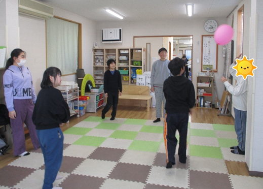 投稿日: 2026年1月16日2026年1月22日運動 風船回ふうせんまわしゲームを行おこないました。 風ふうせん船をおと落さず順じゅんばん番にラリーしてきます。 円えんの真まん中なかにいる鬼おにに風船ふうせんを取とられないように協力きょうりょくしています