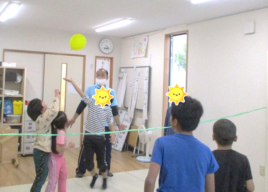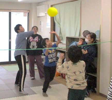 風船ふうせんバレーをおこない、たかげたり、やさしくって仲間なかまにパスしたり、工夫くふうしていました。