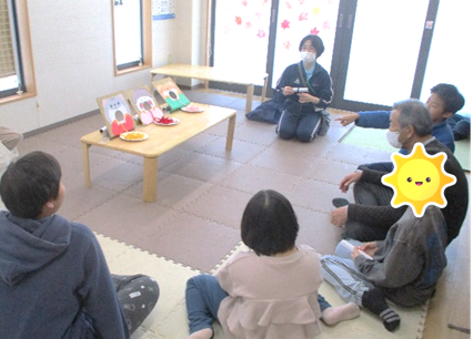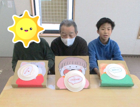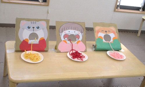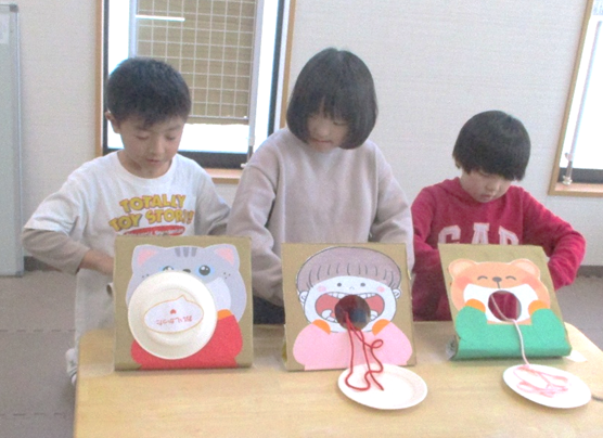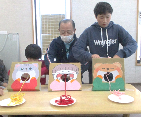 ラップの芯を両手でぐるぐると回して、毛糸を巻いていくゲームをしました。